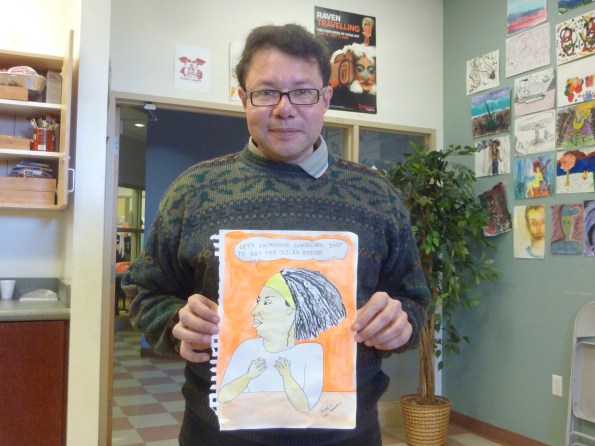 Below is a photo of Jorge Campos showing an illustration he did of Lesley Ewen – our Story Box Facilitator at LifeSkills Centre