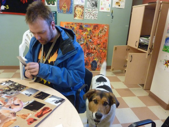 Below is a photo of our Artist Facilitator Pete Bunting creating a beautiful and imaginative collage with his dog Pechan in the Art Room of LifeSkills Centre