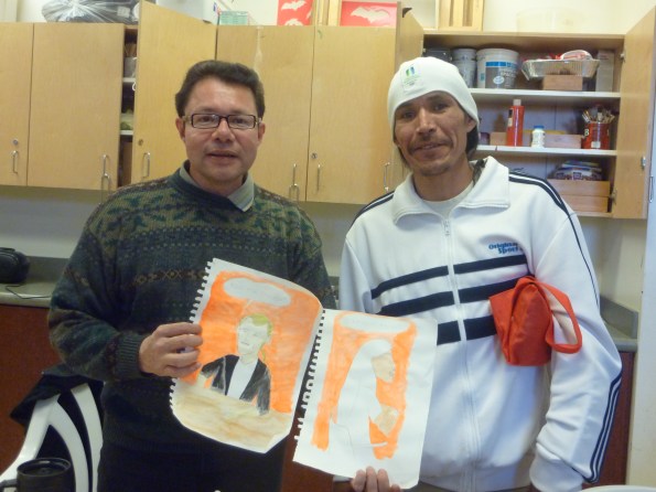Below is a photo of Jorge Campos and Robert Milton holding illustration including one of Robert who participates in our StoryBox Project at LifeSkills Centre