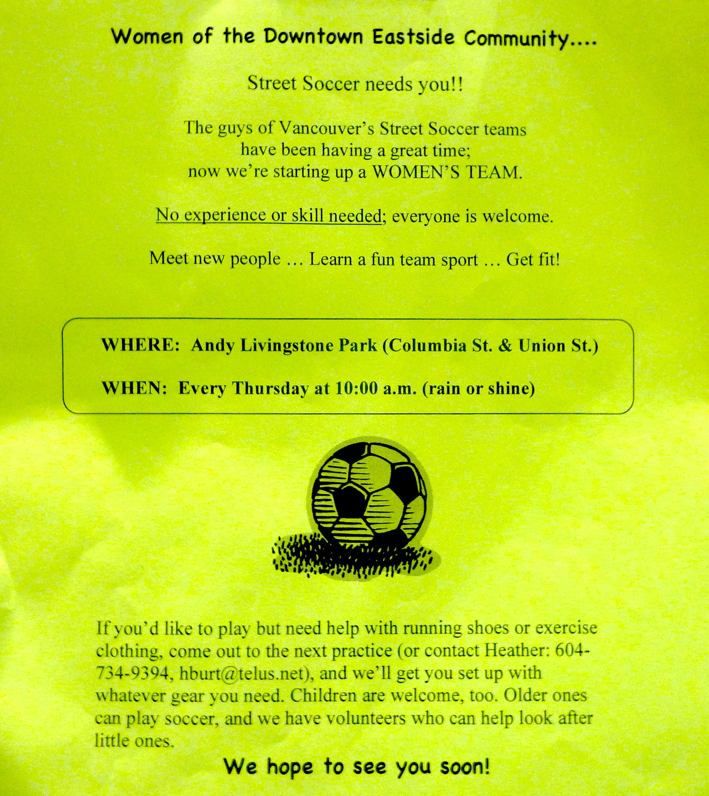 If you’d like to play but need help with running shoes or exercise clothing, come out to the next practice ( or contact Heather: 604-734-9394, hburt@telus.net), and we’ll get you set up with whatever gear you need. Children are welcome, too. Older ones can play soccer, and we have volunteers who can help look after little ones.