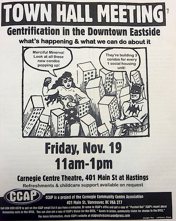 Home > AHA Media, April Smith, Carnegie Centre, Downtown Eastside, DTES, Gentrification, Vancouver, Vancouver Downtown Eastside > Gentrification in the Downtown Eastside Town Hall Meeting – Friday Nov 11am-1pm
