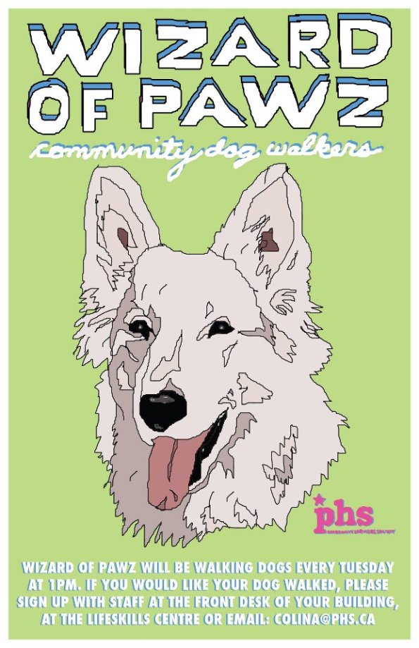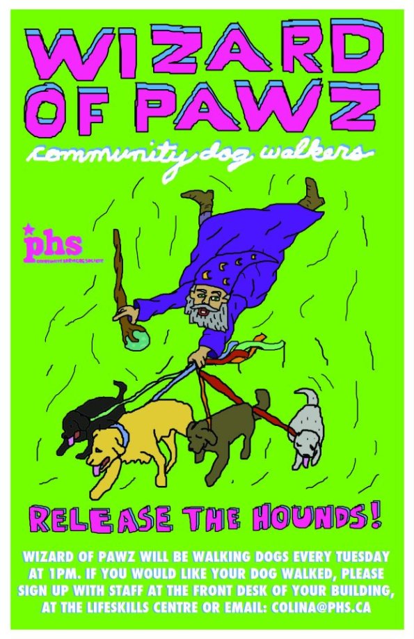 Wizard of Pawz – A dog walking program for resident. Wizard of Pawz will be walking dogs every Tuesday at 11 AM. Please sign up with staff at the front desk of your building, at LifeSkills Centre or email colina@phs.ca