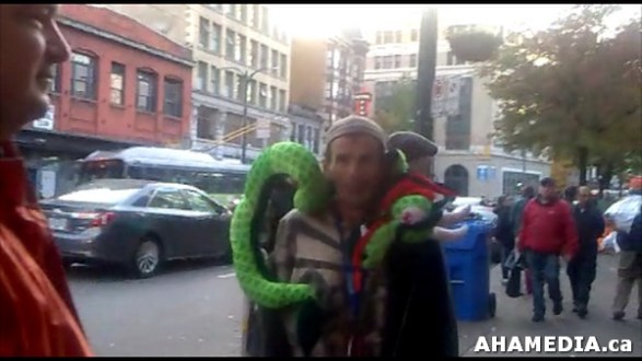 > Roland Clarke and Patrick sees Stuffed Green Snake in front of Bottle Depot in Vancouver Downtown Eastside (DTES) > 36 AHA MEDIA sees Roland Clarke with Pat and their encounter with Stuffed Green Snake in Vancouver DTE