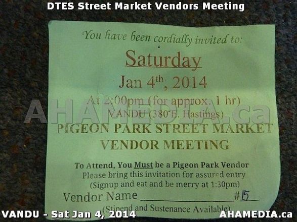 > DTES Street Market Vendors Meeting on Sat Jan 4, 2014 in Vancouver, Downtown Eastside (DTES) > 0 AHA MEDIA sees DTES Street Market Vendor Meeting on Sat Jan 4, 2014 in Vancouver