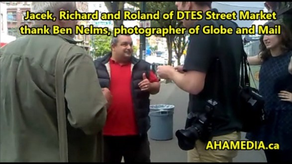 > Roland Clarke, Jacek Lorek and Richard Cunningham have their photos taken by Ben Nelms of The Globe and Mail newspaper > 15 AHA MEDIA sees DTES Street Market get photos taken by Ben Nelms of Globe and Mail newspaper in Vanc