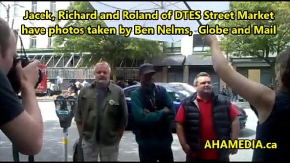 > Roland Clarke, Jacek Lorek and Richard Cunningham have their photos taken by Ben Nelms of The Globe and Mail newspaper > 7 AHA MEDIA sees DTES Street Market get photos taken by Ben Nelms of Globe and Mail newspaper in Vanc