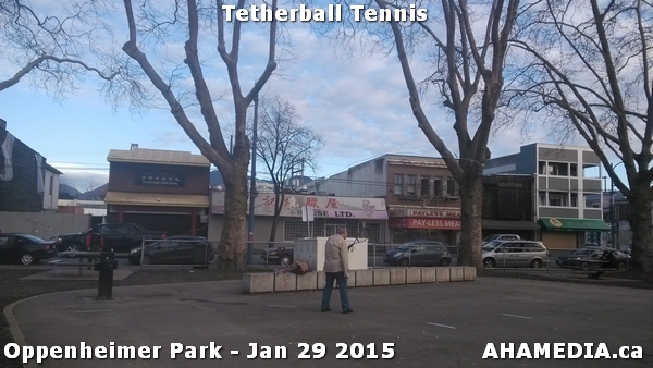 > AHA Media, Community Engagement, Downtown Eastside, DTES, Oppenheimer Park, Vancouver, Vancouver Downtown Eastside, Vancouver DTES > Man plays tetherball Tennis in Oppenheimer Park, Vancouver DTES