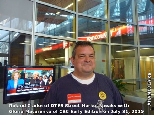 > Roland Clarke of DTES Street Market speaks with Gloria Macarenko of CBC Early Edition on July 31, 2015 > 2 AHA MEDIA sees Roland Clarke of DTES Street Market with Gloria Macareno of CBC Early Edition Jul 31