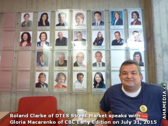> Roland Clarke of DTES Street Market speaks with Gloria Macarenko of CBC Early Edition on July 31, 2015 > 6 AHA MEDIA sees Roland Clarke of DTES Street Market with Gloria Macareno of CBC Early Edition Jul 31