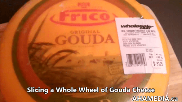 > Slicing a wheel of Gouda Cheese > 1 AHA MEDIA films a wheel of Gouda Cheese being sliced in Vancouver (2)