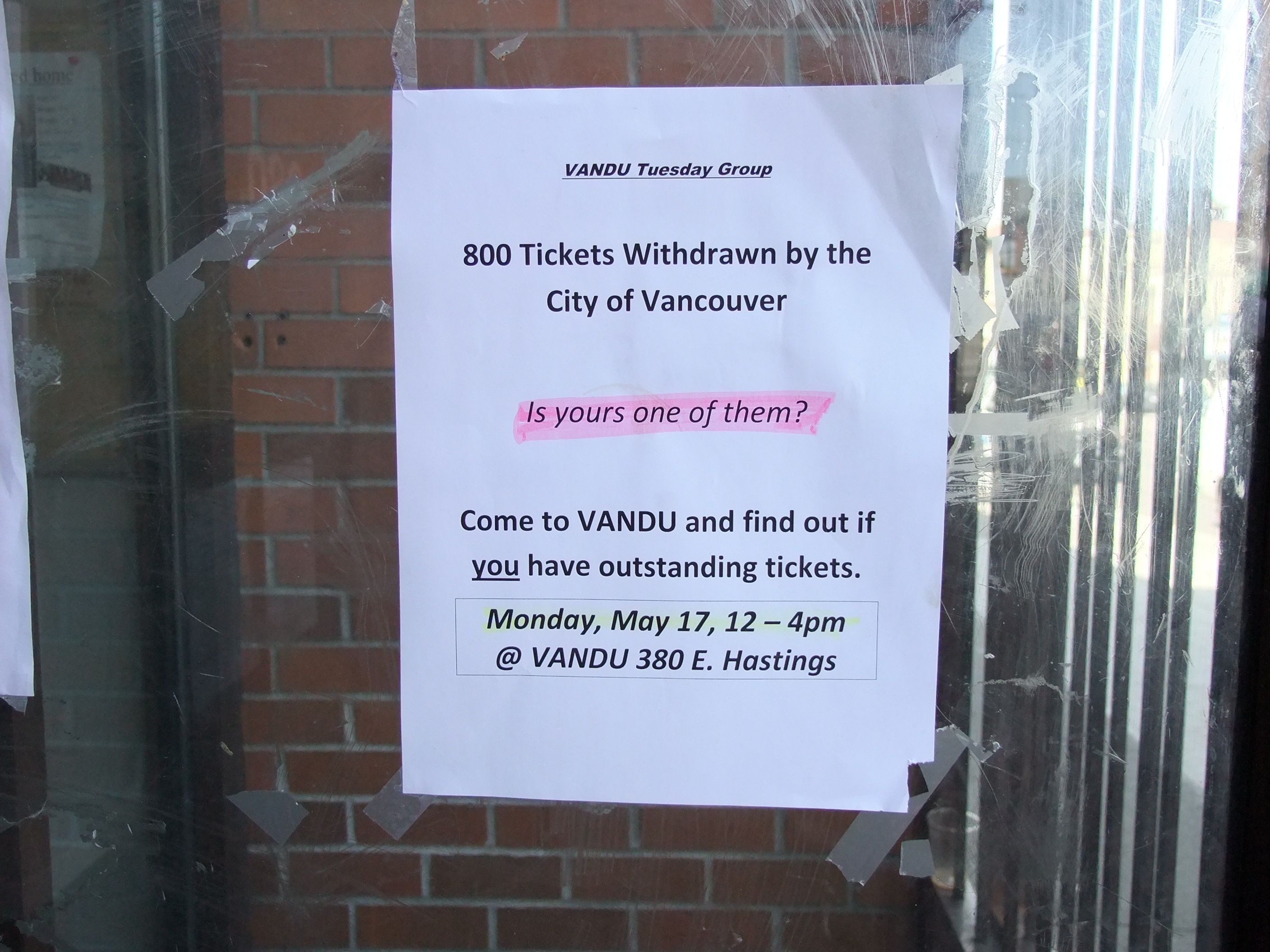 ” 800 Tickets withdrawn by City of Vancouver…Is yours one of them? Come to VANDU to see if you have outstanding tickets”